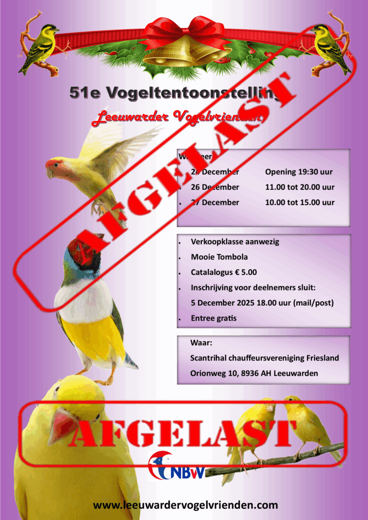 Naar verwachting zal vandaag of morgen (2 of 3 december 2025) een landelijk tentoonstellingsverbod worden afgekondigd voor het tentoonstellen van vogels. Dit verbod houdt in dat het samenbrengen van vogels op één locatie niet is toegestaan. Het geldt voor alle vormen van samenkomst, waaronder tentoonstellingen, keuringen, markten en beurzen.